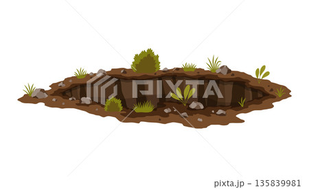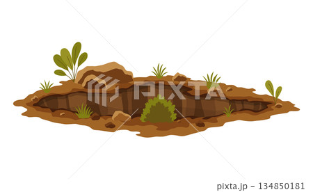 Hole ground. Entrance underground, big crack or ruin. Dirty, dark entrance, detailed drawing in cartoon style. Deep pit. Cartoon den of wild animal