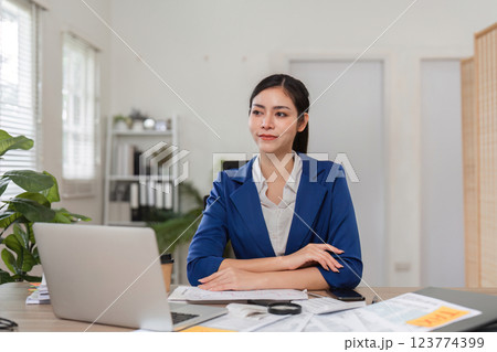 Business woman using tablet and laptop for doing math finance on an office desk, tax, report, accounting, statistics, and analytical research concept
