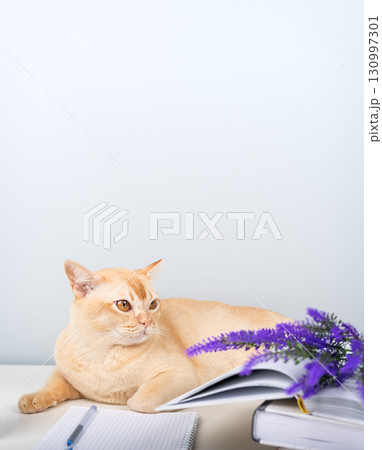 A Burmese cat with books and a notebook on the table is a smart pet at home.