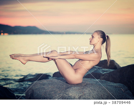 nude female doing yoga poses at sunset sea shore