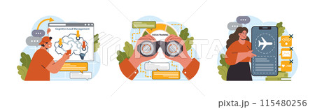 Hyperfocus set. Focus and concentration skill. Self-discipline and time management. Organization for performance efficiency. Flat vector illustration