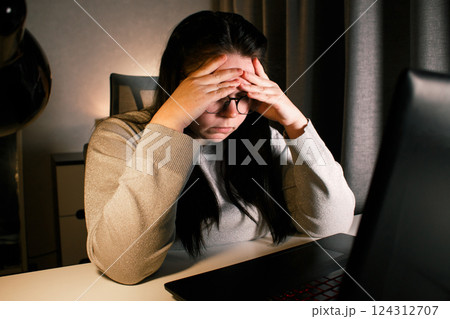 Hard working woman works on computer in her home office and tries to solve work problems. Feeling despair and burnt out from job issues.
