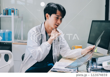 Positive doctor working on laptop in medical office, portrait.