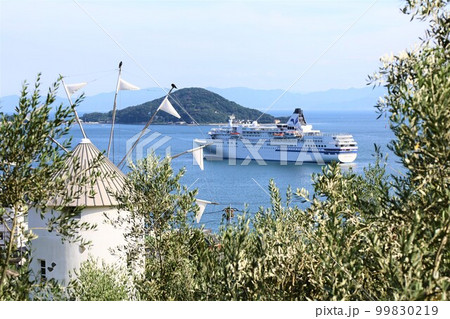 夏の牛窓オリーブ園から見た牛窓港に入港するまえじま丸 岡山県瀬戸内市