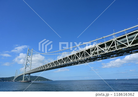 兵庫県の本州と淡路島に架かる明石海峡大橋を淡路市から見る