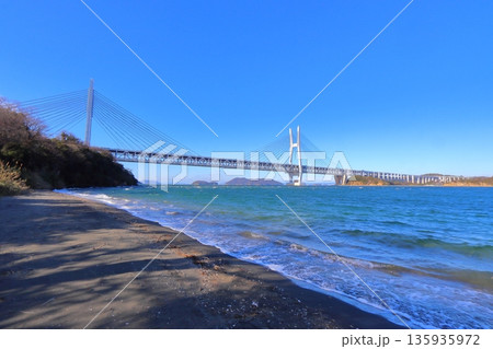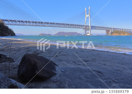 岩黒島 黒浜海岸と瀬戸大橋(瀬戸内海 塩飽諸島)
