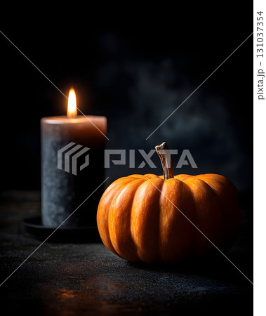 A small, bright orange pumpkin sits beside a lit black candle against a dark moody background.