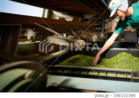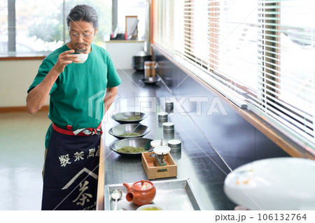 製茶工場で荒茶の香りをチェックするベテランの茶師