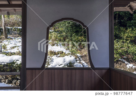 京都嵐山・二尊院 本堂廊下の火打窓から見る雪景色