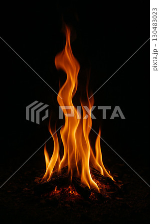「薪が燃えるリアルな炎のイラスト - キャンプや暖炉に最適な背景素材」