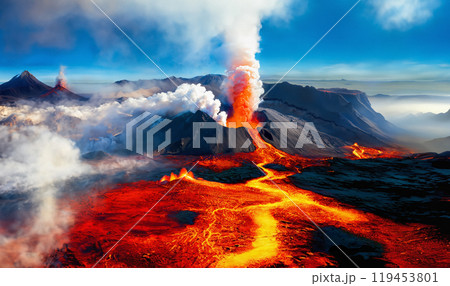 Eruption of a volacano emitting lava plume under a scenic sky