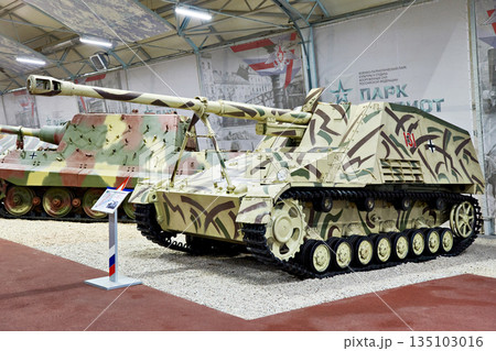 Russia. March 14, 2021. The AK-176 automatic naval artillery system and the B-34USM artillery system are displayed in the open air as museum exhibits in the Patriot Park in Kronstadt.
