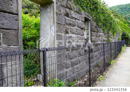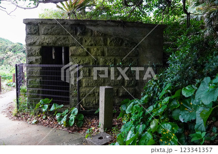 石造りの家に白いドア(四国ミウゼアム灯台エリアの退息所の扉)