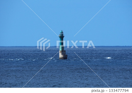 岩礁に建つ灯標と大海原