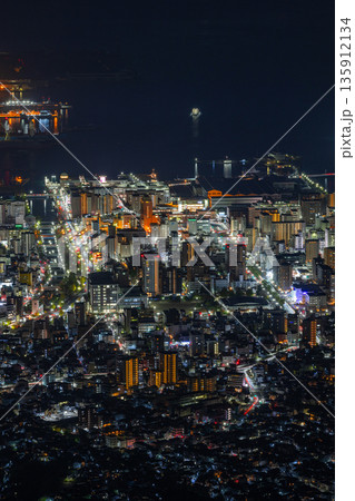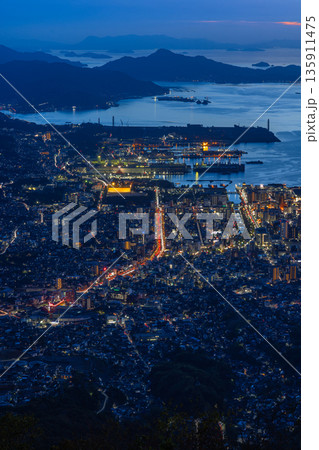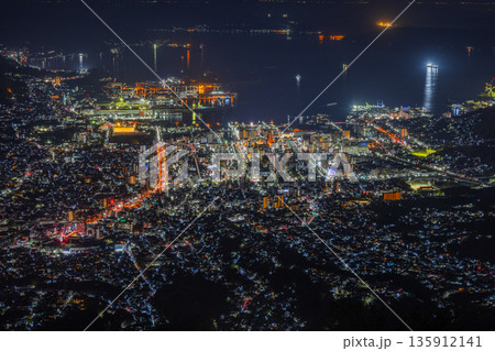 日本 広島県呉市栃原町にある灰ヶ峰の展望台から望む呉の市街地の夜景と瀬戸内海