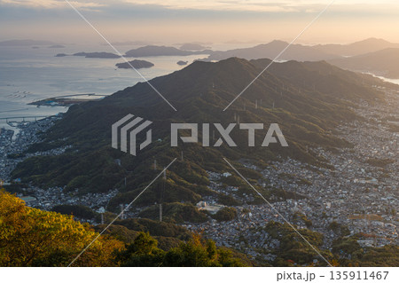 日本 広島県呉市栃原町にある灰ヶ峰の展望台から望む夕暮れ時の呉の市街地と瀬戸内海