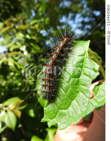 アジサイの葉に着く害虫「クワゴマダラヒトリ」の幼虫