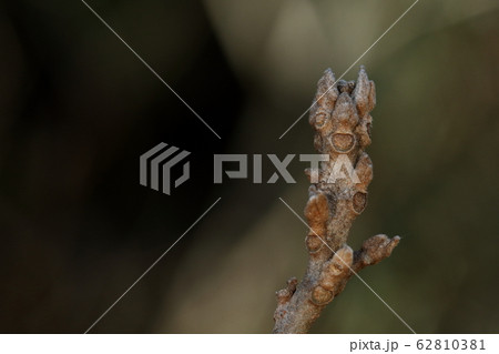自然 植物 アカメガシワ、芽吹いた若葉は鮮やかな赤色ですが冬芽は灰色のモンスター風