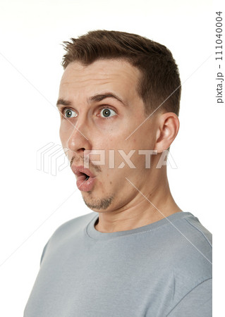 surprised guy looking at camera on white studio background
