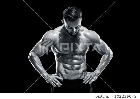 Studio shot of attractive man wearing black jeans posing shirtless over white background. Muscular body shape