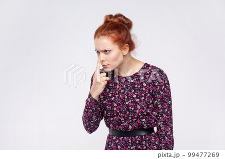 Portrait of ginger woman wearing dress pointing nose doing lie gesture, suspecting trickster in falsehood, her look expressing distrust, disbelief. Indoor studio shot isolated on gray background.