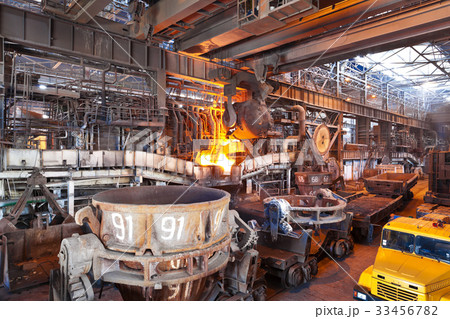 Pouring of liquid metal in open hearth workshop