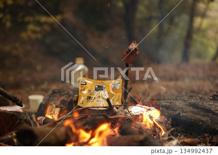 飯盒炊爨 キャンプで焚き火のイメージ写真素材