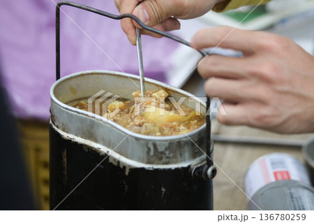 飯盒でカレーを作る男性