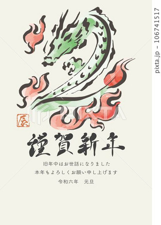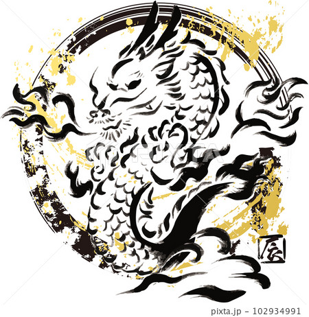 年賀2024 年賀状 辰 辰年 たつ タツ 龍 筆文字 墨絵 水墨画 日本画 手描き イラスト素材