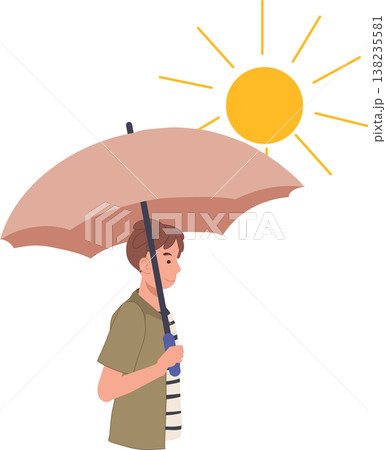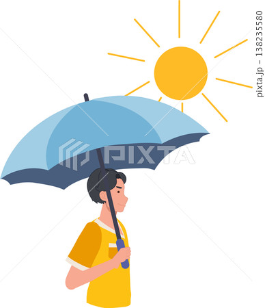 male character walking outside using umbrella for sun protection under bright sun. hot weather and climate awareness