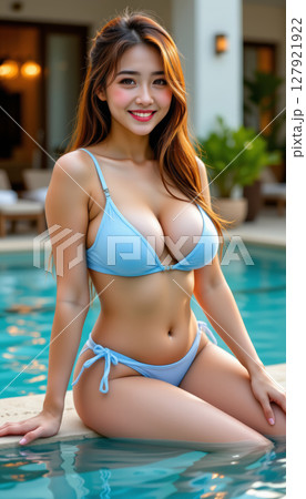 A beautiful young woman in a light blue bikini poses by a luxurious poolside under the sun. With long flowing hair and a radiant smile
