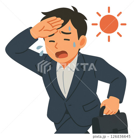 猛暑の中を急ぐスーツ姿の男性、炎天下で汗をかくビジネスマンのイラスト、真夏の通勤ラッシュで疲れる会社