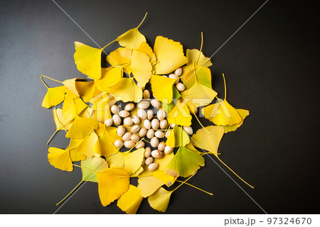 黄金色に染まったイチョウの葉と、イチョウの実のぎんなん
