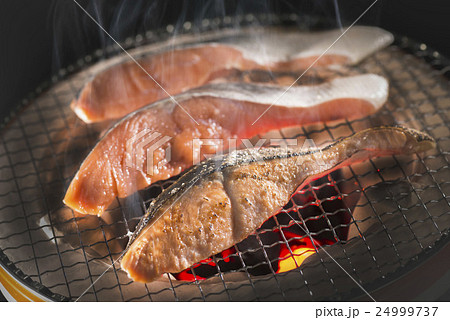 新鮮な鮭の七輪の炭火焼き