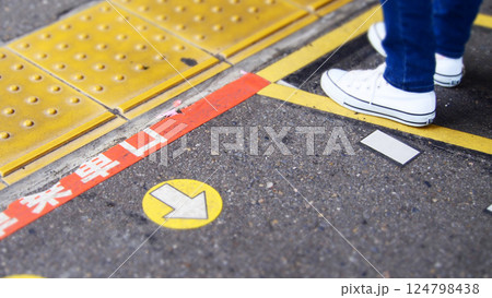 駅ホームの床に描かれた乗車位置案内 整列を促す床表示と点字ブロック