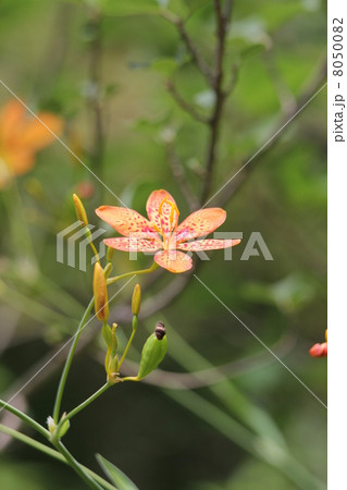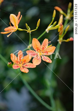オレンジ色のヒオウギの花が咲いています。学名はIris domesticaです。