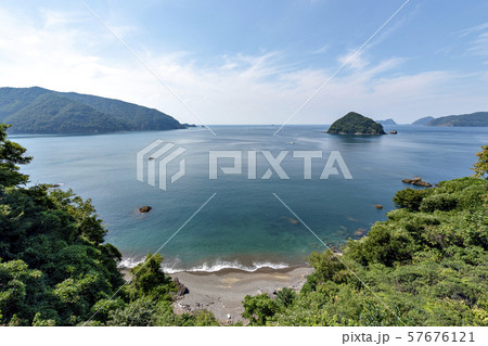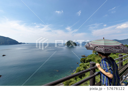 日本 福井県三方上中郡若狭町の三方五湖レインボーラインの駐車場から望む日本海と獅子ヶ崎と烏辺島