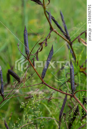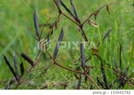 Common vetch climbing with tendrils in the field during late summer showing dark brown seed pods ready for harvest