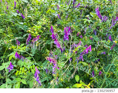 Purple vetch flowers growing among green leaves in a natural meadow. Ecology, biodiversity, and wild flora representing balance between agriculture and natural environment.