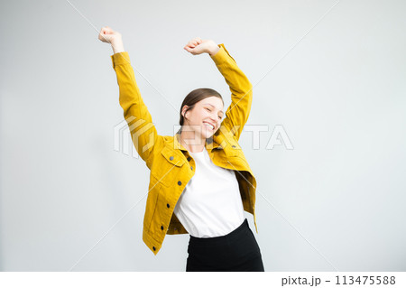 Young woman 20s wears casual clothes stand on toes dance lean back have fun spreading hands isolated on plain light white background studio portrait