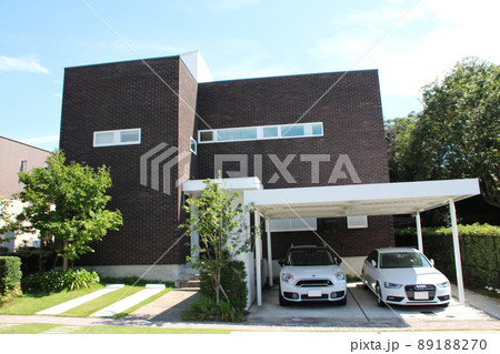 青空に映える電柱のない落ち着いた雰囲気のタイル張りで美しくラグジュアリーでスタイリッシュな邸宅