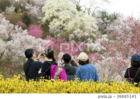 福島に桃源郷ありと詠まれた満開の花見山公園を散策する観光客