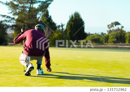 African American man with cap crouching on putting green placing golf ball with putter, copy space