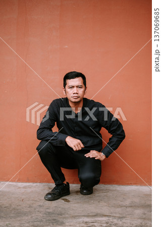 Serious young man in black squatting against a terracotta wall