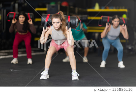 Determined young woman performing sandbag squats