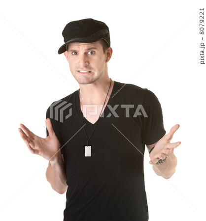 What? Not sure, answer concept. Brutal man looking at camera. Studio shot
