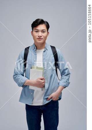 Portrait of smiling young college student with books and backpack against white background
