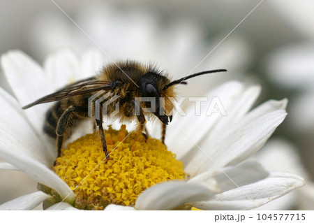 Closeup on a male banded mud bee, Chalicodoma or Megachile ericetorum on a white yellow flower