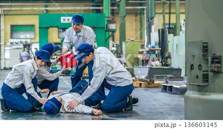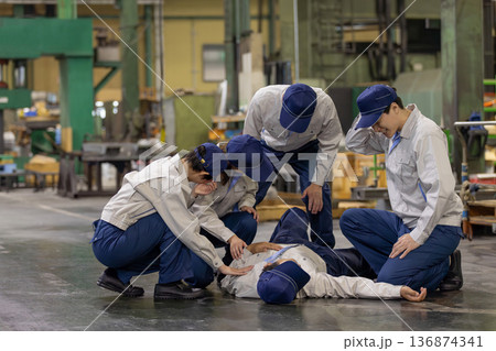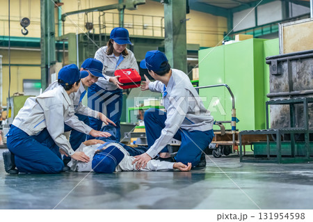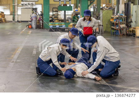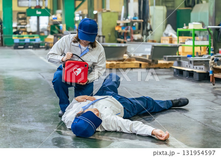 工場で倒れた作業員を発見し助けを呼ぶ女性作業員