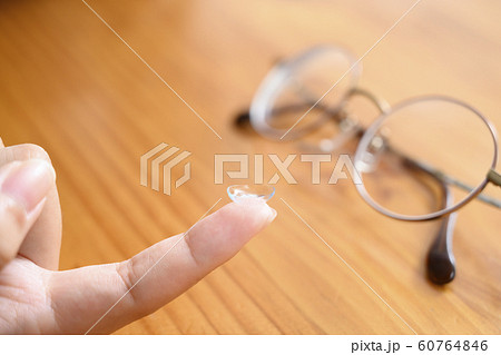 コンタクトレンズと女性の指とメガネ